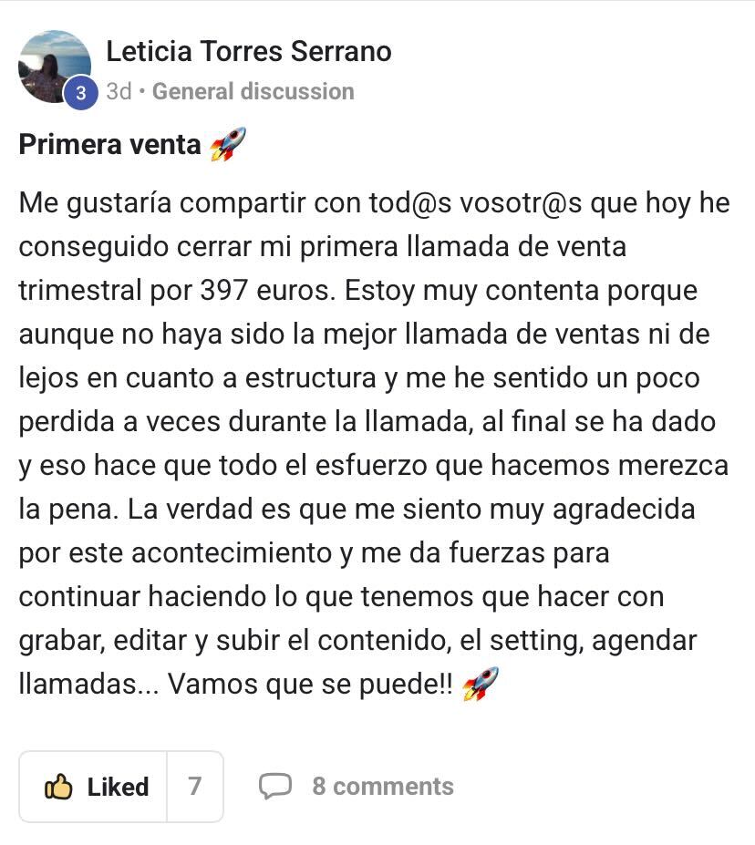 “Hoy he cerrado mi primera llamada de venta trimestral por 397 €. No ha sido la llamada perfecta ni la más estructurada, pero aun así el paciente dijo que sí. Ver que alguien invierte esa cantidad en mi programa hace que todo el esfuerzo de grabar, editar contenido y agendar llamadas merezca la pena. Antes veía esto como algo imposible; ahora sé que tengo un sistema y que solo es la primera de muchas.”